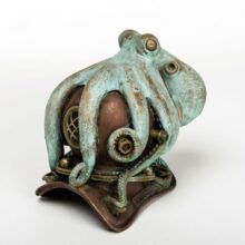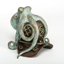 Verdigris bronze resin octopus on a bronze, copper, and brass resin diving helmet.