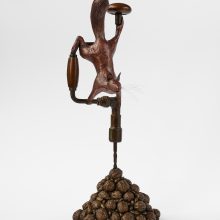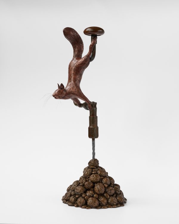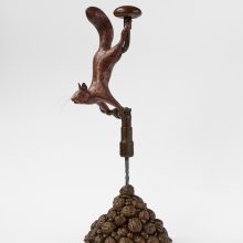 Copper resin Squirrel on a Tin, Iron and Bronze resin drill, drilling a pile of bronze resin Nuts.